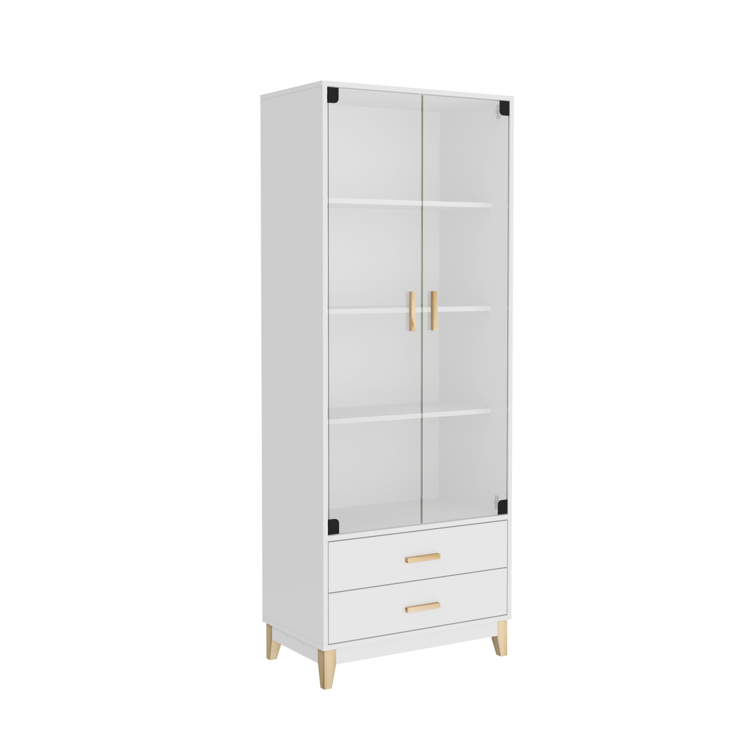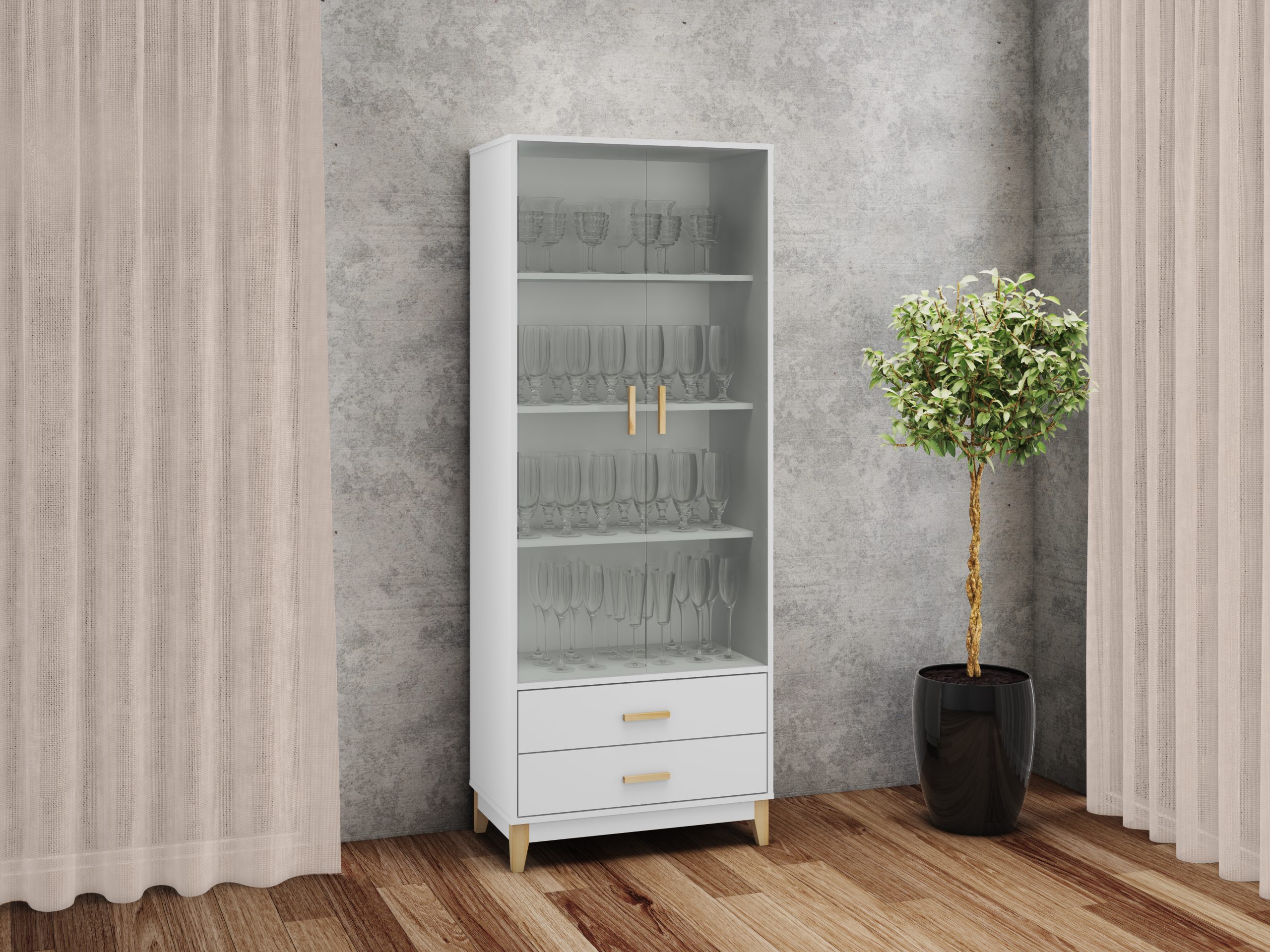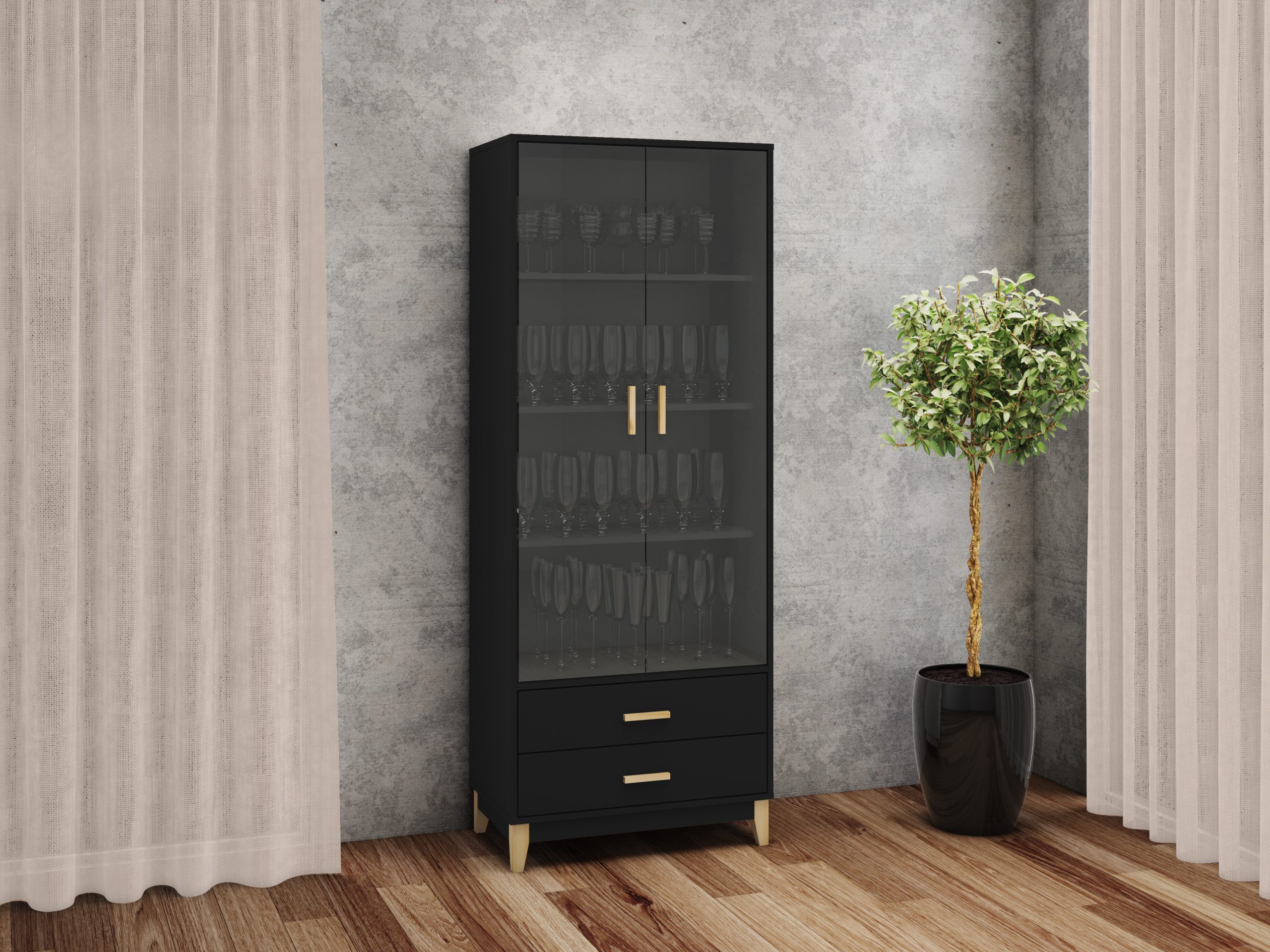 - Cristalero 2 Puertas y 2 Cajones. Fabricado en MDP 15 mm, MDF 3 mm. Pie de madera, tirador de madera. Correderas metálicas. Puertas de cristal de 4 mm.