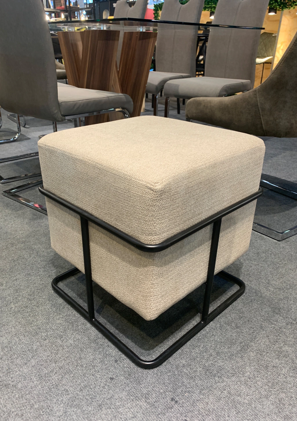 - Puff Parker apilable, tapizado en beige, rojo, grís o verde y base de hierro.
