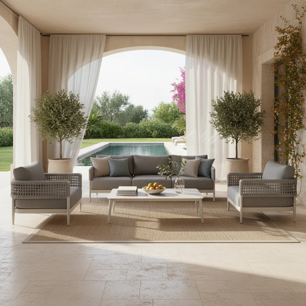 Juego de exterior de 4 piezas. Incluye 1 mesa rectangular, 2 sillones de 1 cuerpo y 1 sillón de 3 cuerpos. Producto importado de excelente calidad.
